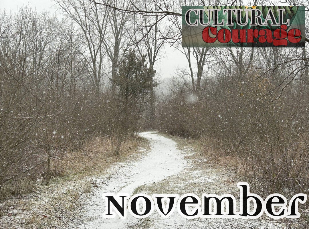 I’ve shared many times that I enjoy planning the month for Cultural Courage by hitting the photos and seeing if I can perhaps sense a mood for the month with the memories I dislodge from my head. Today’s banner for this last CC for November 2024 was the first one that caught my eye when I laid this month out, but I didn’t select it at the beginning of the month because we weren't in cold conditions yet and I truly didn’t think we were going to get any snow. I took that photo last year on a hike out at Seven Lakes State Park, it’s my hiking go-to in fall and winter. And since we’re getting out first significant snow today, I'm including it. Think of the snow covered road as the journey into winter we are about to take.